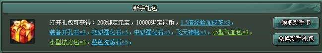宠物进化丹*3,橙色洗练石*3,紫色宠物洗髓丹*3,低级宝石合成符*3, 中级宝石合成符*3,飞天神靴*30,大型气血包*1,大型法力包*1, 3级生命宝石*3,1.5倍经验符*20,绑定元宝*200,绑定铜币*50000 |
