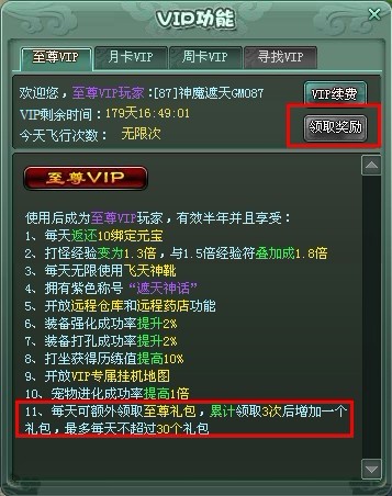 活动内容:活动时间内,购买VIP半年卡后使用成为“至尊VIP”,除了享受打怪经验提升到1.3倍、每天可无限次使用飞天神靴等福利外,每天还将额外领取到一定数量的“至尊VIP福利包”,“至尊VIP福利包”每天可领取一次,每累计领取3次“至尊VIP福利包”的次日可额外再多领取一个福利包,最多每天可同时领取30个“至尊礼包”。